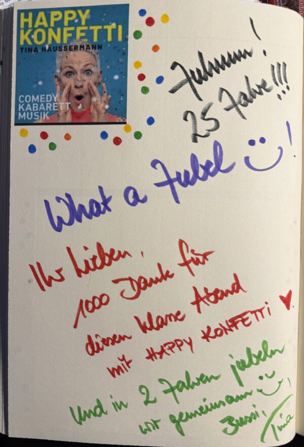Ratlosigkeit beim StaubsaugerkaufIn den Liedern und Geschichten in „Happy Konfetti“ geht es um das alltägliche Leben, betrachtet mit Humor, Ironie und mit dem Blick der Kabarettistin. Esoterik und spirituelle Modeerscheinungen gehören zu den Themen, denen sich Häussermann annimmt. Es ist zum Brüllen komisch, wenn sie in einem Lied erzählt, wie sie in einem Volkshochschulkurs bei einer Achtsamkeitstrainerin Gelassenheit geübt hat, das „Ooom“ als Ausdruck der Achtsamkeit übt und gleich danach überzeugend einen herrlichen Wutanfall spielt. Und dank Häussermann erfährt man, dass das Baumumarmen beim Waldbaden die Ursache des Waldsterbens sei. Denn so ein Baum möchte nicht von jedem umarmt werden. Damit jeder sieht, wie das so ist, wird der Besucher Klaus zur Buche und von der Kabarettistin umarmt.