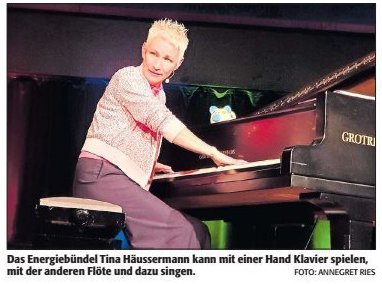 Tina Häussermann ist auch eine sehr gute Sängerin und Pianistin. Und sie kann gleichzeitig mit einer Hand Flöte, mit der anderen Hand Klavier spielen und dazu singen. Als das Publikum diese Leistung nicht würdigt, droht sie, „ich mache das so lange, bis ihr applaudiert“, was sofort den gewünschten Erfolg hat, wohl auch deshalb, weil die Flötentöne etwas schräg sind.